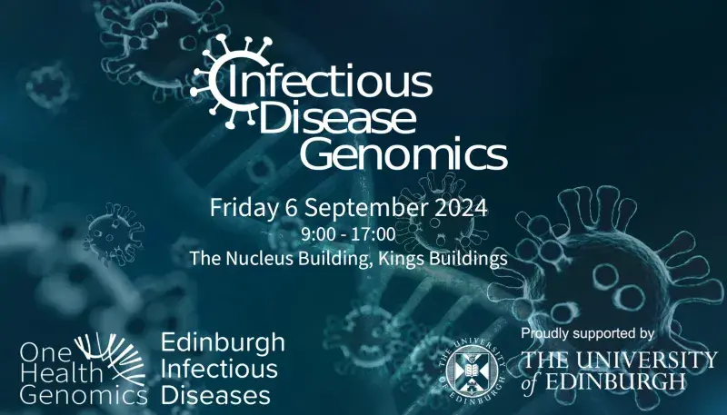 Infectious Disease Genomics Symposium 2024 The One Health Genomics Edinburgh and Edinburgh Infectious Diseases networks are delighted to invite you to a joint symposium - this one-day event, to held on the 6th September in the Nucleus Building at the Kings Buildings Campus, will showcase infectious disease research that takes a genomics approach to explore the interactions of hosts and pathogens.There will be keynote presentations from Professor Johannes Krause (Max Planck Institute for Evolutionary Anthropology in Leipzig) and Professor Mara Lawniczak (Sanger Institute), alongside a fantastic programme of University of Edinburgh speakers presenting exciting new work in plants, animals, humans, and aquaculture.About Johannes Krause (external link)About Mara Lawniczak (external link)There will also be poster sessions throughout the day, and opportunities for poster pitches by ECRs - please register by 22nd August to submit a poster abstract. Click here to register your place Programme9:30 Tim Aitman (One Health Genomics Edinburgh) - Introduction and WelcomeSession 1(Chair Tim Aitman)9:40 Mara Lawniczak (The Sanger Institute) - Genomic resources for malaria control10:20 Kenny Baillie (Centre for Inflammation Research) - Inferring molecular mechanisms from host genetics10.40 Poster pitchesAnum Ahmad (The Roslin Institute) - Comparison of Dynamics of Udder Skin Microbiota from Grazing Yak and Cattle During the Perinatal Period on the Qinghai–Tibetan PlateauRob Kelly (R(D)SVS) - Using deep-amplicon sequencing to understand the dynamics of gastrointestinal nematodes present in co-grazed host species kept in a Scottish zoological collection10:50 Coffee and PostersSession 2(Chair Stella Mazeri)11:20 Sara Clohisey (Baillie Gifford Pandemic Science Hub) - The host and the pathogen in severe influenza A virus infection11:40 James Prendergast (The Roslin Institute) - Uncovering the basis of natural genetic tolerance to East Coast fever12:00 Katie Dubarry (The Roslin Institute) - Immune cell transcriptomics in sheep12:20 Tim Regan (The Roslin Institute) - Harnessing PRR Diversity and Pan-Genomics to Improve Resilience in Farmed Mussels 12:40 Poster pitchesVivien Shek (University of Dundee) - Novel RELM-β binding molecule identified from Heligmosomoides polygyrus bakeriMuhammad Bilal (R(D)SVS) - Effect of sampling bias on disease transmission rates between the speciesInnocent Chibwe (The Roslin Institute) - Genotypic characterization of antimicrobial resistance genes in Aeromonas Caviae isolates from Patients with Cholera-like Illness during a 2022 -2023 Cholera Outbreak in Malawi12:50 Lunch and postersSession 3(Chair Ian Jackson)13:50 Simon Biddie (Institute of Genetics and Cancer/The Usher Institute) - Genomic approaches to uncover functional variants in inflammation and infection14:10 Carolina Mayes (School of Social and Political Sciences) - Accounting for the host factor: Susceptibility and resistance in pre-genomic genetic epidemiology14:30 Beatriz Orosa (School of Biological Sciences) - Ubiquitin plant immune response and pathogen subversion14:50 Clark Russell (Centre for Inflammation Research) - Genomics approaches for identifying macrophage microbicidal responses against pneumococci15:10 Coffee and PostersSession 4(Chair Ross Fitzgerald)15:40 Laura Glendinning (The Roslin Institute) - Understanding the role of the microbiome in poultry16:00 Johannes Krause (MPI Leipzig) - The genetic history of the Plague and the origin of the Black Death16:40 Ross Fitzgerald (Edinburgh Infectious Diseases) – Closing Remarks16:45 Drinks reception Click here for more information on the speakers. Sep 06 2024 09.30 - 16.30 Infectious Disease Genomics Symposium 2024 An OHGE and EID joint symposium showcasing infectious disease research that takes a genomics approach. KB Nucleus, Kings Buildings Symposium Information on Eventbrite (external link)